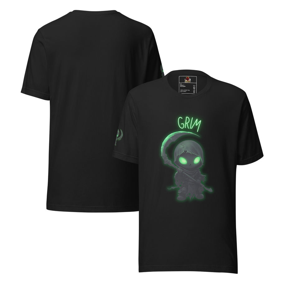 This adorably spooky t-shirt features a chibi-style Grim Reaper with a mischievous twist! The cute lil Reaper stands front and center, cloaked in a flowing, jet-black robe with tattered edges, giving off just the right amount of eerie charm. Its oversized, glowing eyes—radiating a vibrant neon green or fiery orange—sparkle with playful menace, drawing attention to its skull-like face peeking out from under a hooded cowl. In its tiny skeletal hands, it grips a wickedly sharp scythe, held at a jaunty angle, ready to harvest souls (or maybe just some compliments!