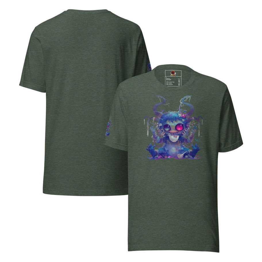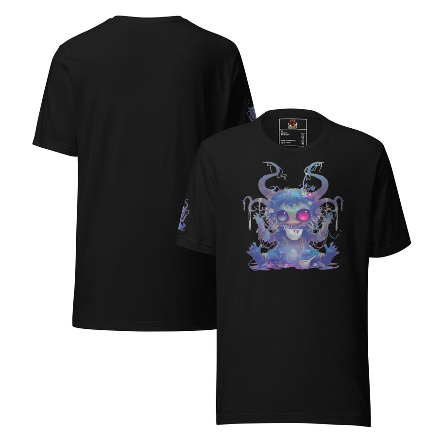 This adorable T-shirt features a playful ramen noodle monster, with a squiggly, noodle-like body and big, googly eyes, happily slurping up a bowl of steaming ramen noodles. The monster’s mischievous grin and chopsticks in hand add a whimsical touch, while vibrant colors like golden broth, red chili flakes, and green scallions pop against the soft cotton fabric. Perfect for foodies and fans of quirky, kawaii-style designs, this shirt brings a fun, cozy vibe to any casual outfit.